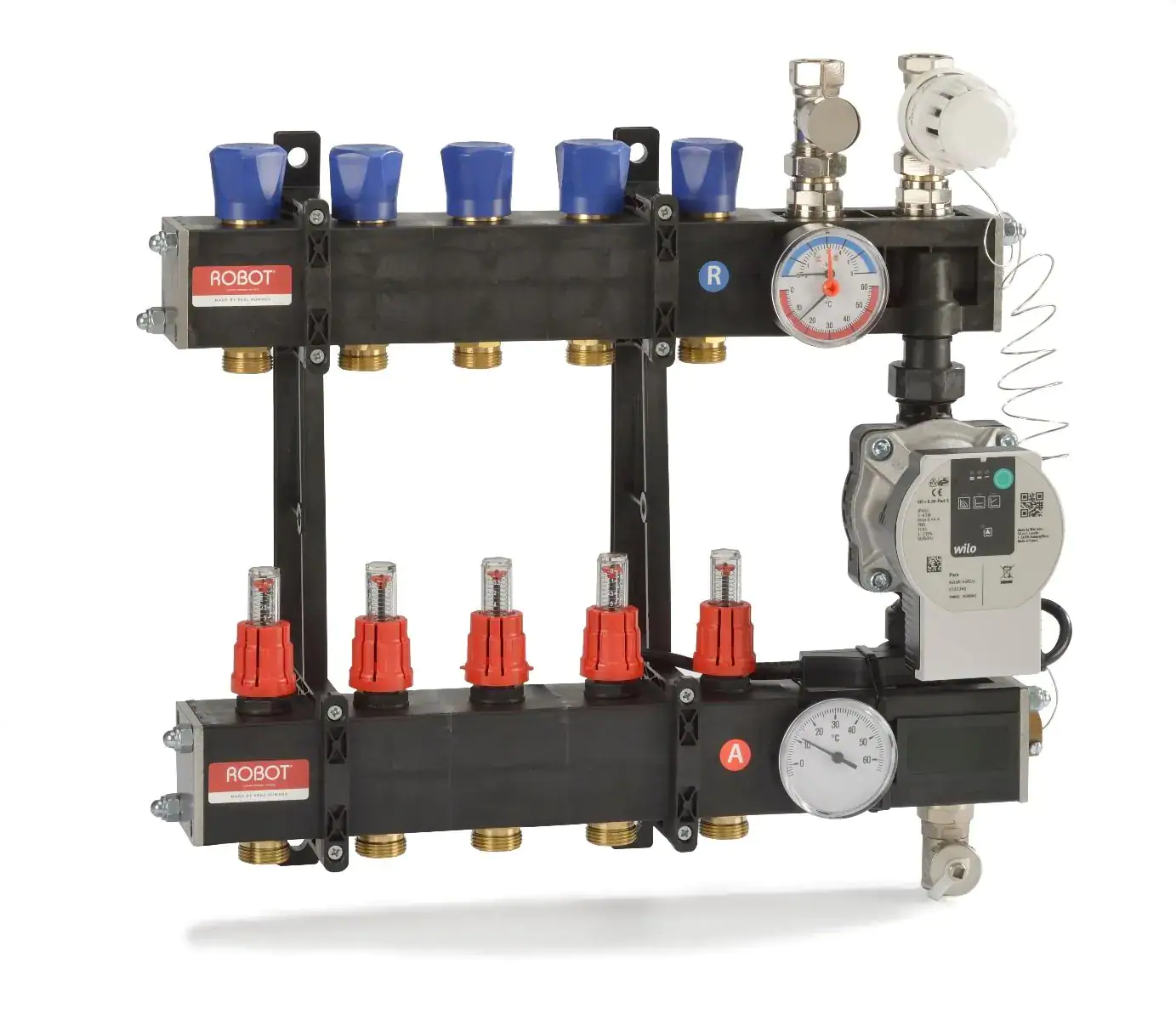 De Robot LTVC verdeler is een verdeler met pomp. De verdeler van composiet is geschikt voor aansluiting op zowel hoog- en laagtemperatuur verwarmingsbron.. De Robot LTVC verdeler is voorzien van een inregelventiel, waardoor het mogelijk wordt om de vloer-retourstroom in te regelen.